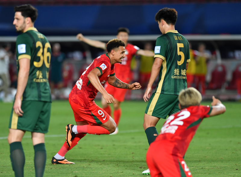 6月22日,河南俱乐部酒祖杜康队球员费利佩·卡多索(中)在比赛中庆祝进球。\n 当日,在河南郑州举行的2025中国足球协会杯第四轮比赛中,河南俱乐部酒祖杜康队主场3比2治服浙江俱乐部绿城队,晋级下一轮。\n 新华社发