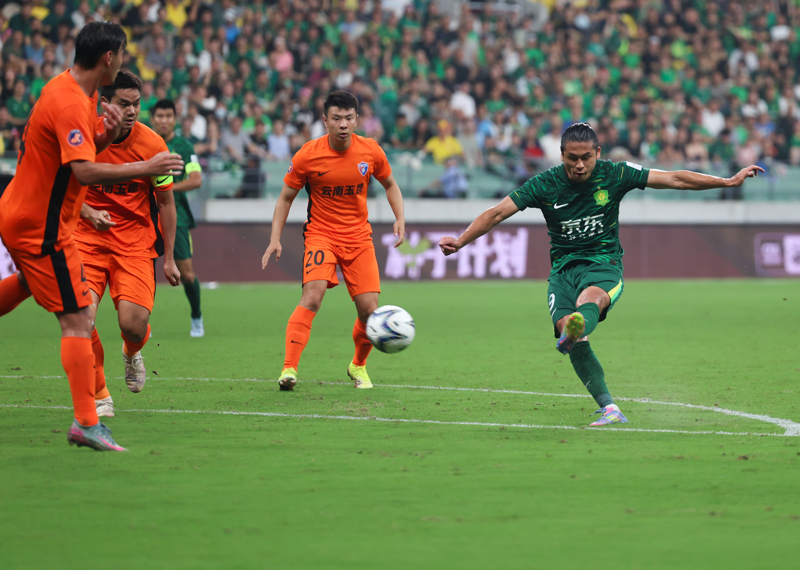8月20日,北京国安队球员张玉宁(右一)在比赛中射门。\n 当日,在北京举行的2025中国足球协会杯半决赛中,北京国安队主场7比0治服云南玉昆队,晋级决赛。\n 新华社记者 胡星宇 摄